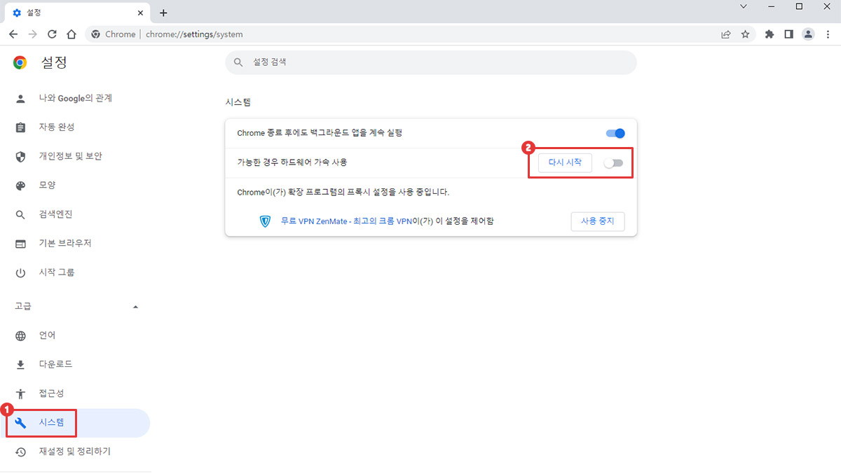 가능한 경우 하드웨어 가속 사용 의 체크를 해제하고 다시 시작을 누릅니다.