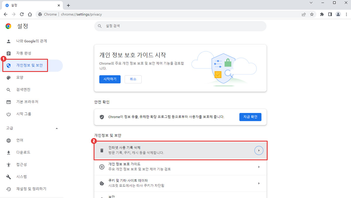 인터넷 사용 기록 삭제를 누릅니다.