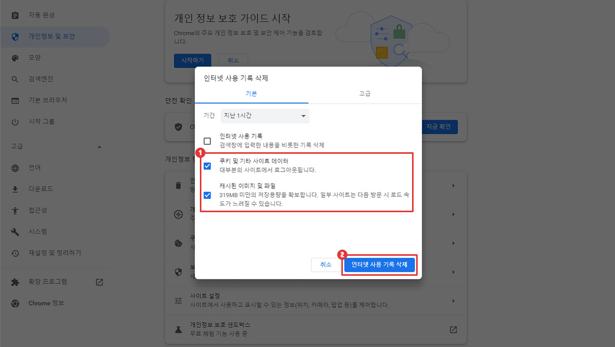 쿠키 및 기타 사이트 데이터와 캐시된 이미지 및 파일 삭제를 체크한 후 인터넷 사용 기록 삭제 버튼을 누릅니다.
